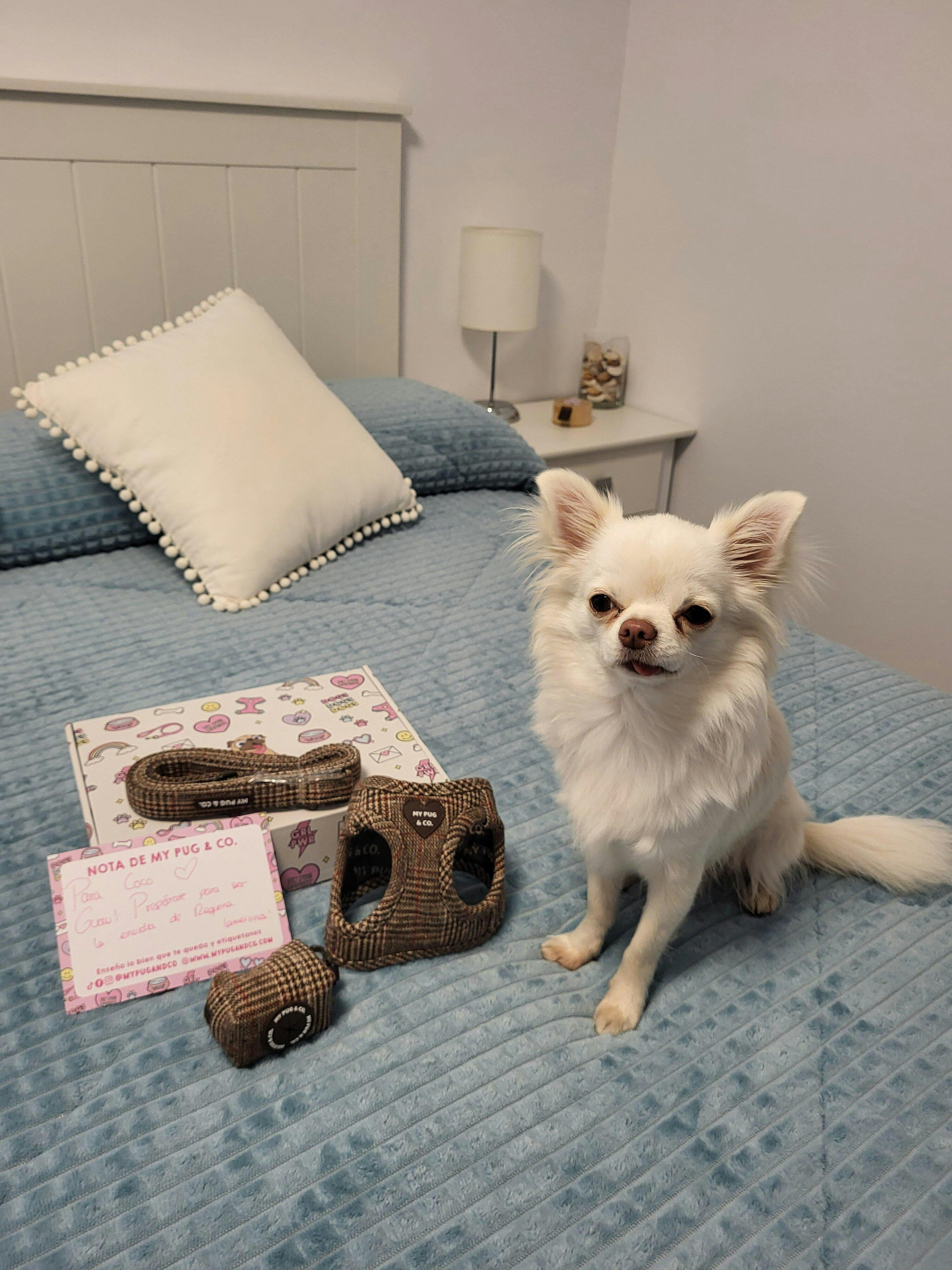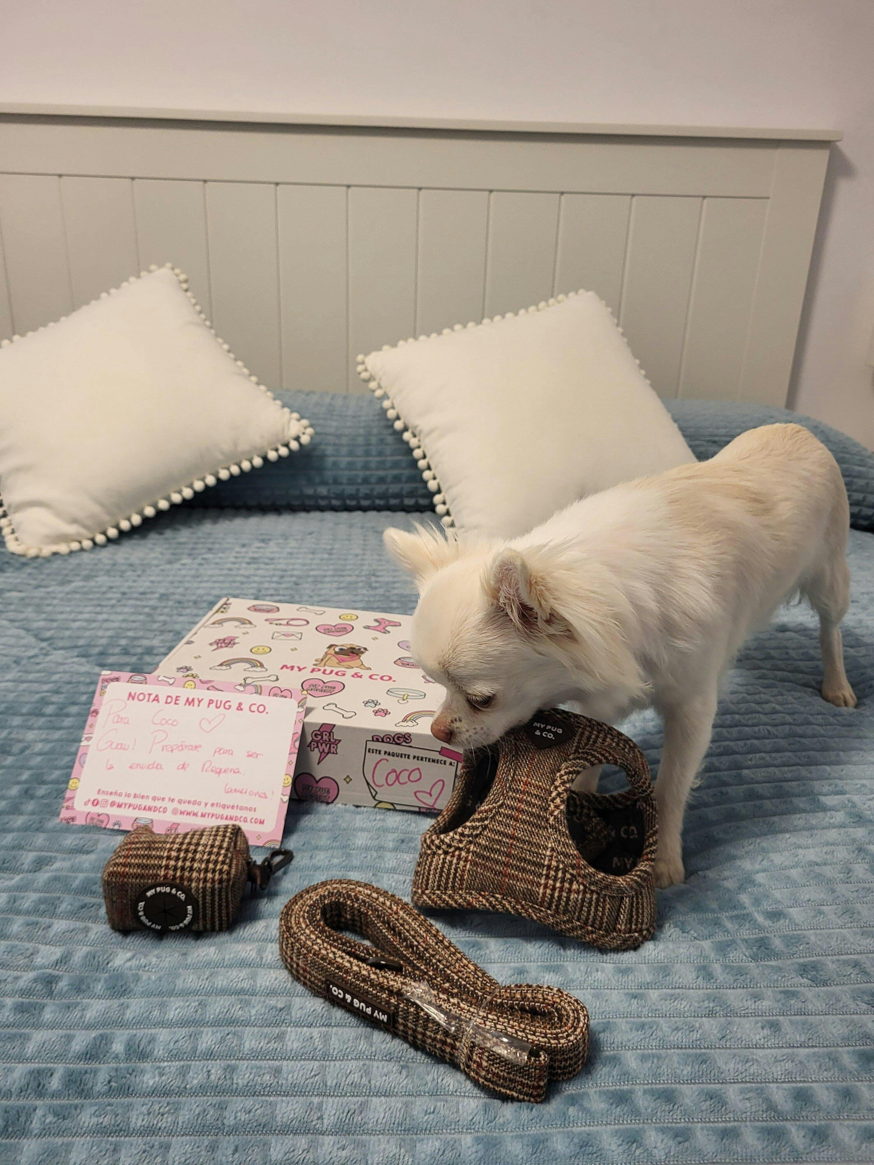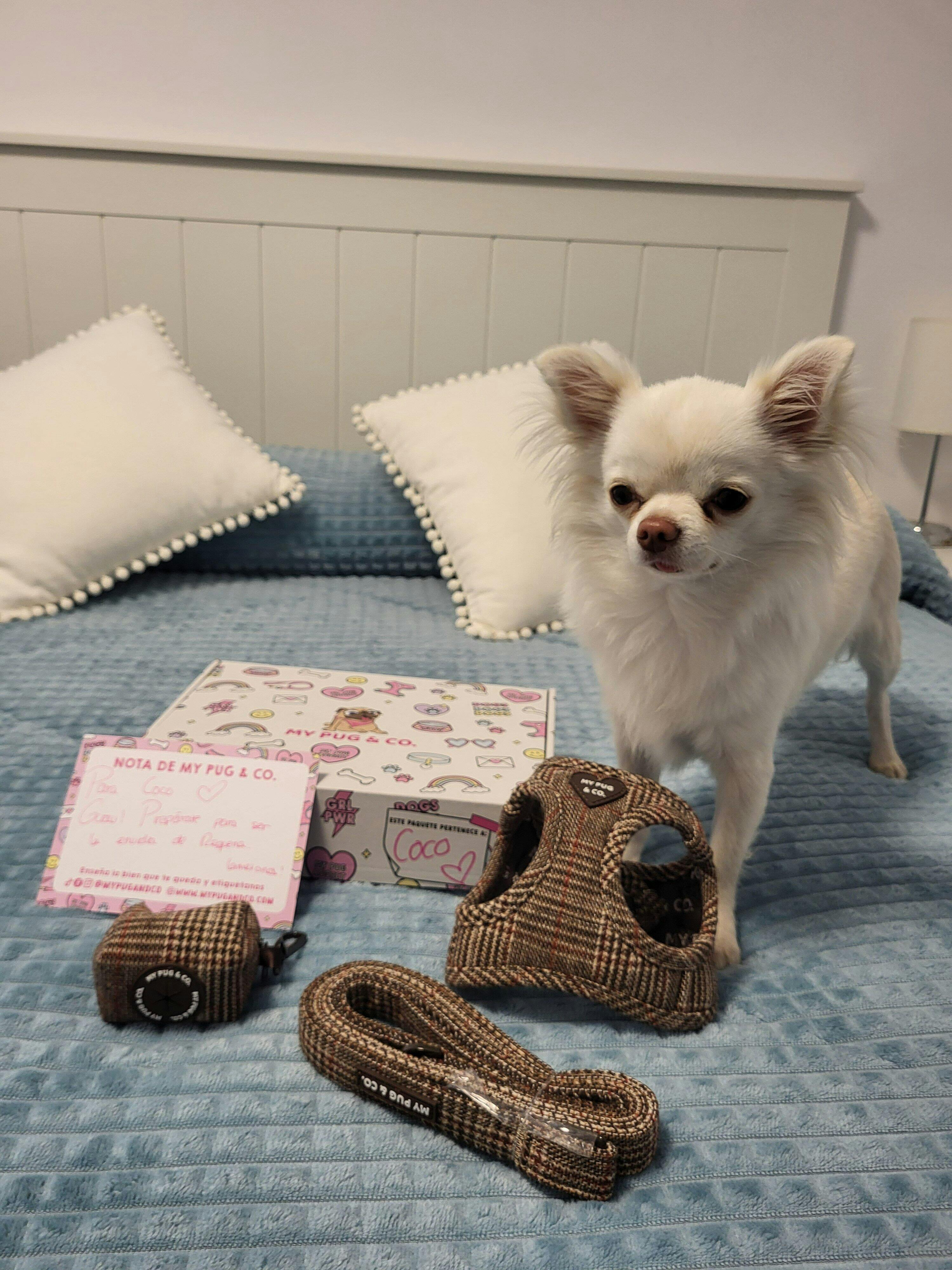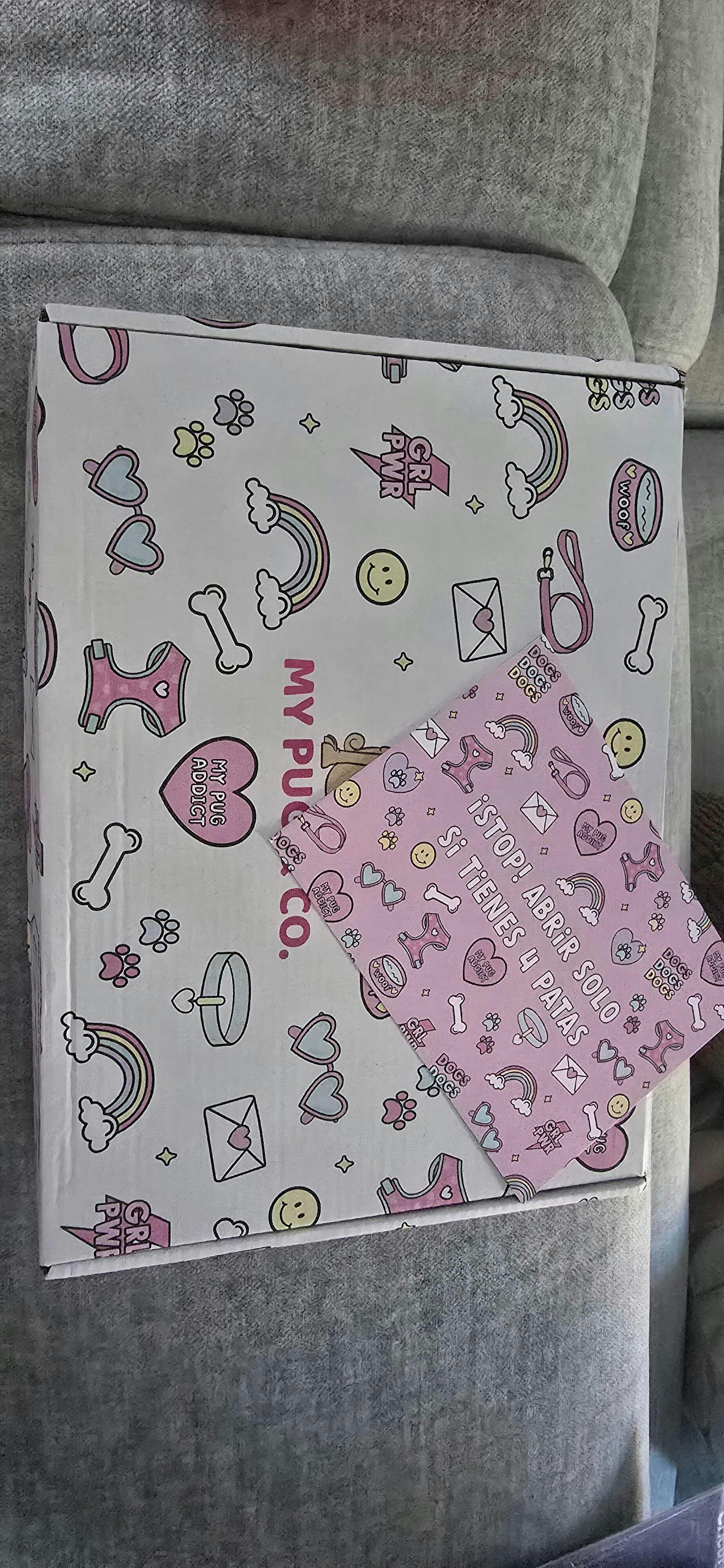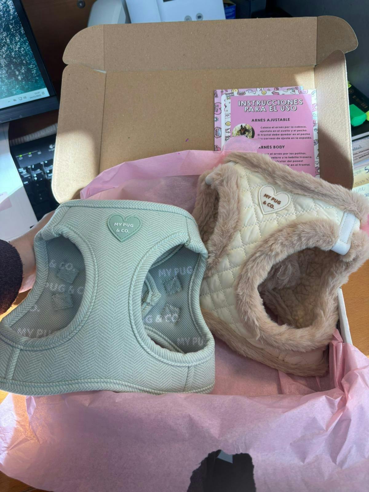 Fascinada con My Pug & Co! El envío fue rapidísimo y el envoltorio, simplemente inmejorable. Compré un arnés, una correa y un portabolsas a juego, y todo llegó en una caja preciosa y divertida, envuelto con mimo en papel de seda… ¡y con una galleta de regalo para mi perrita! 🐾 Mejor imposible. Os dejo una foto de Bimba con su arnés precioso de Ágatha Ruiz de la Prada 💖