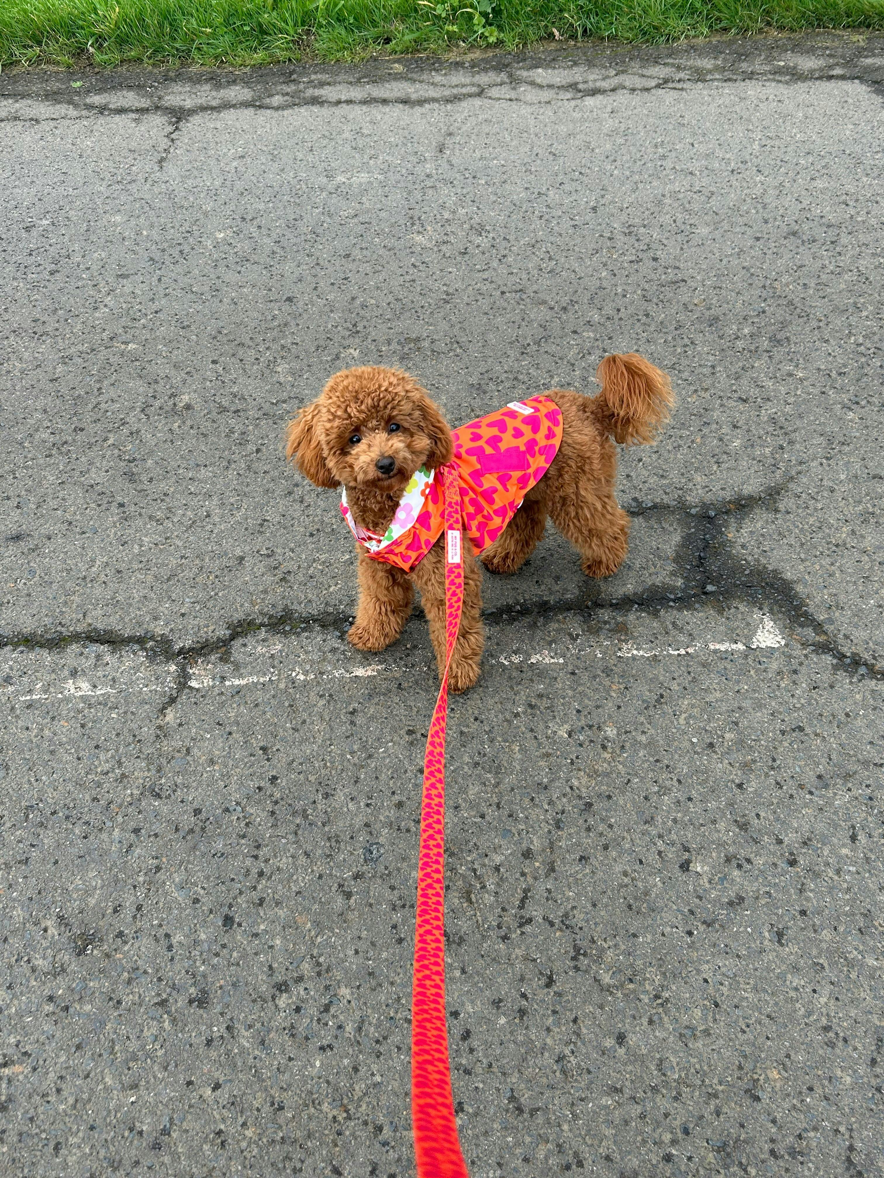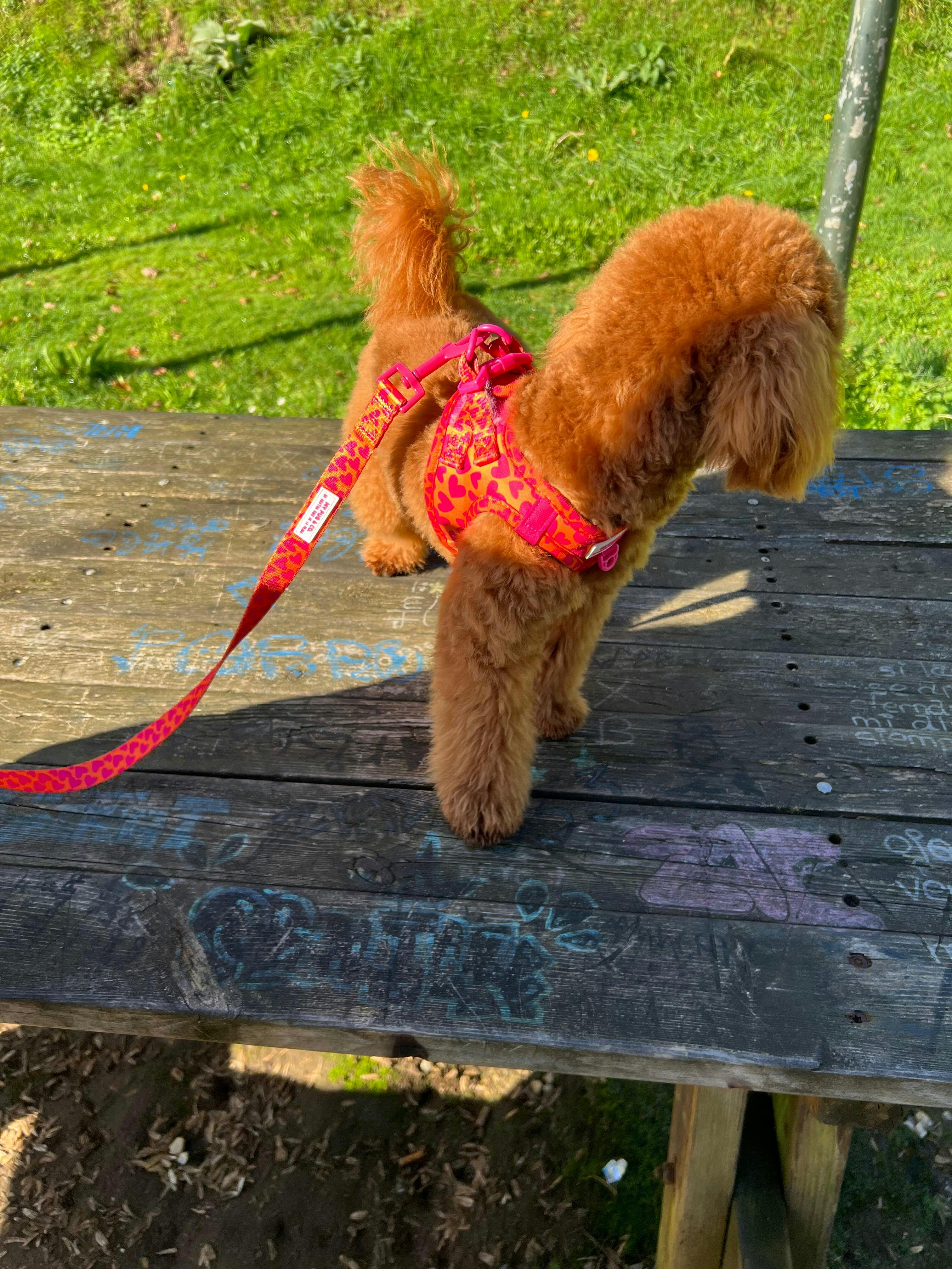 Greta está muy contenta con su nueva correa que le hace juego con su arnés. Los colores super ideales y muy cómoda para jugar en el parque.